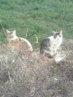 ベランダでいきなり「ダンッ」と結構大きい音が聞こえたので吃驚して恐る恐る窓を開けてみれば、其処には室外機の上に乗るにゃんこが二匹。